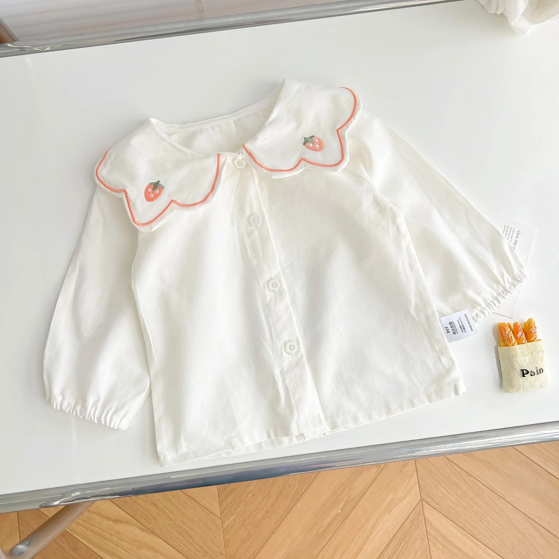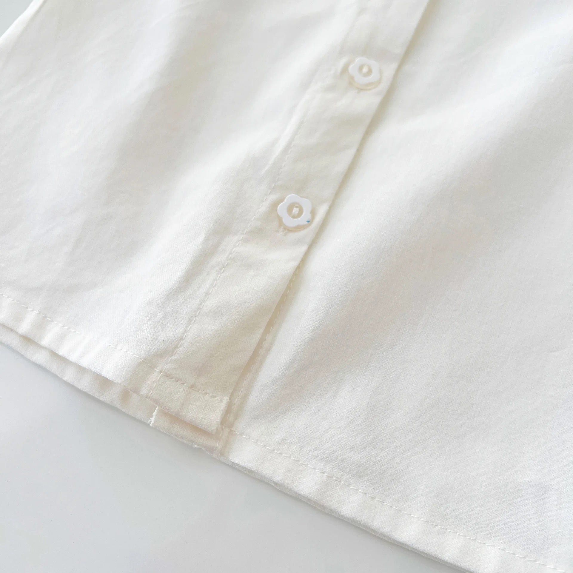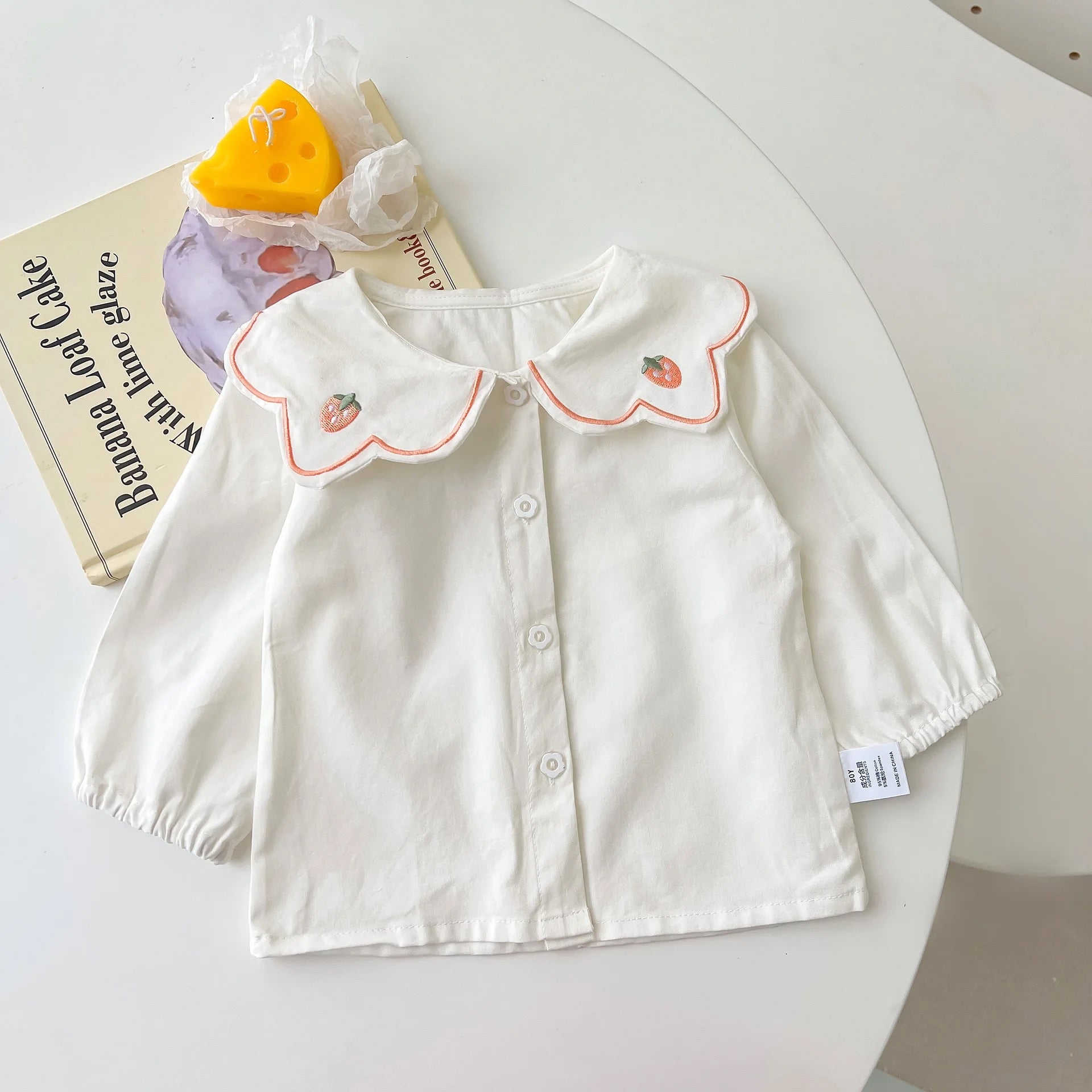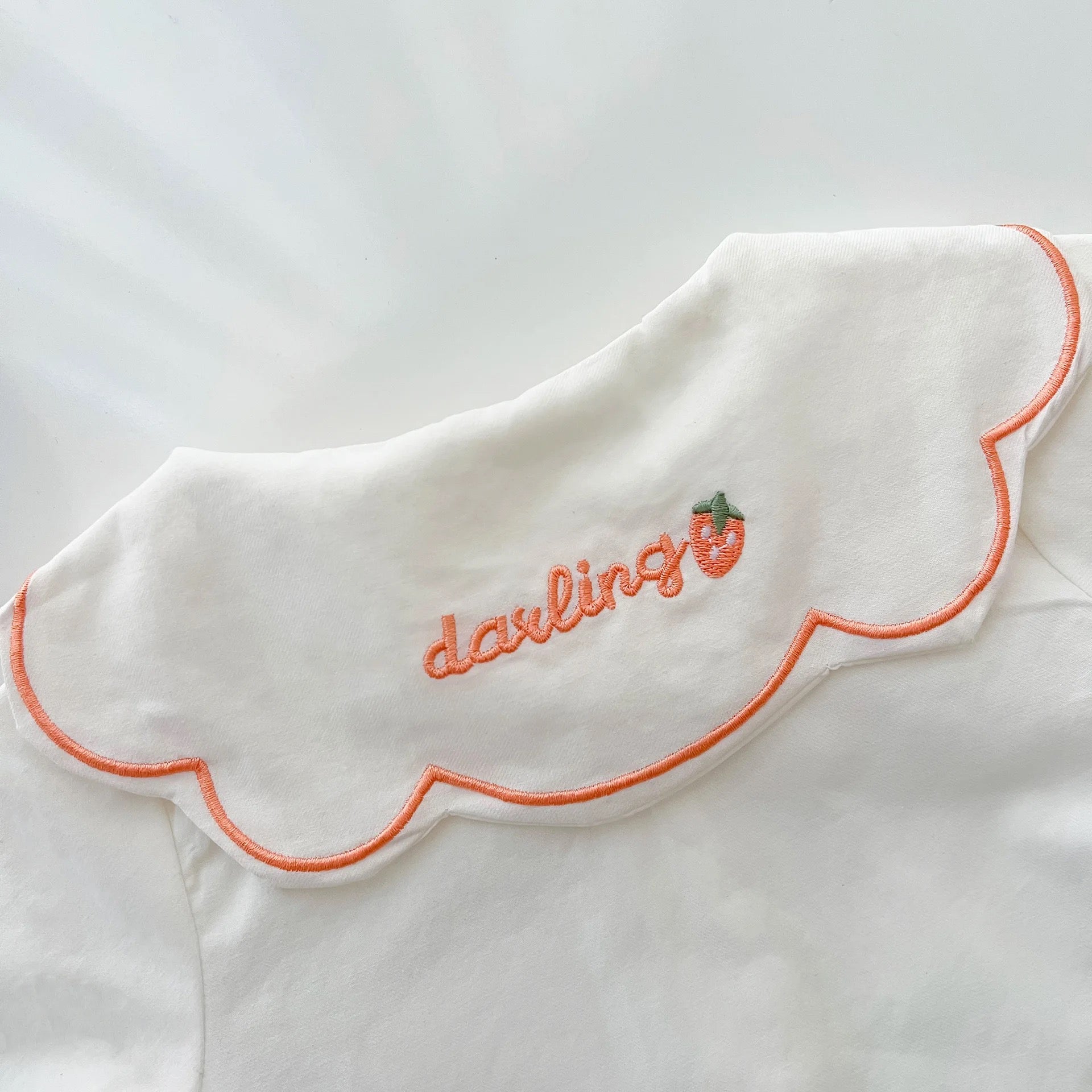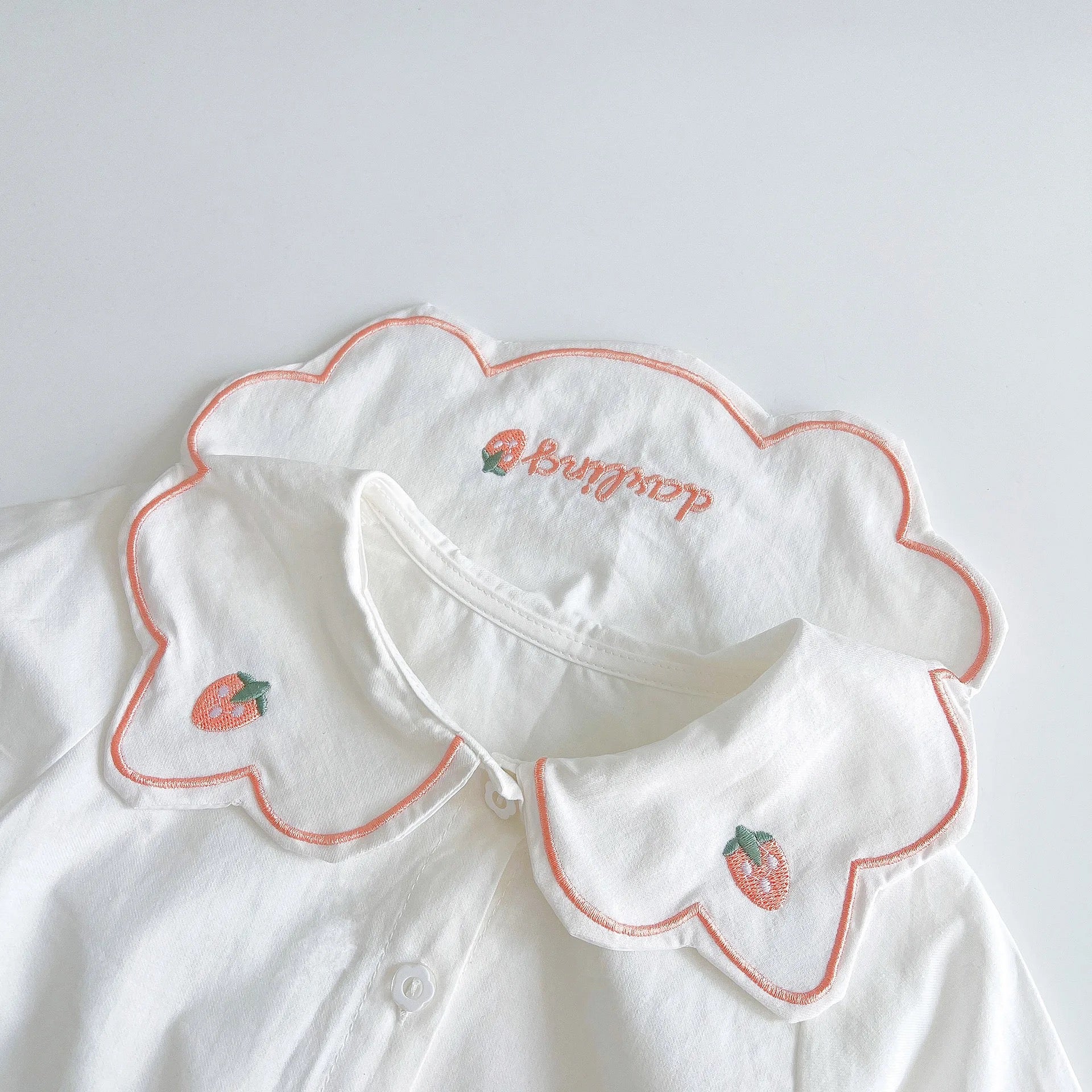 Strawberry embroidered romper at the collar with balloon sleeves.