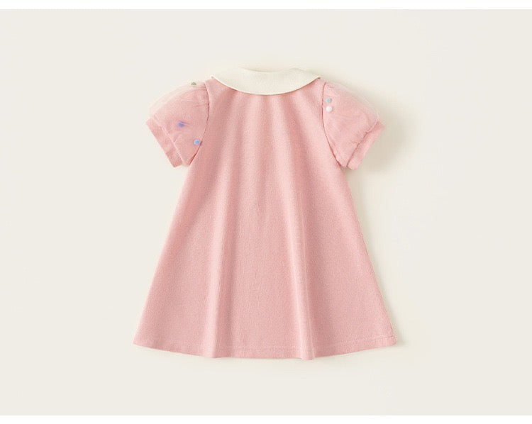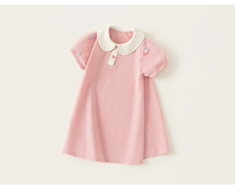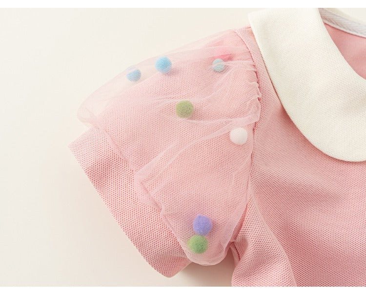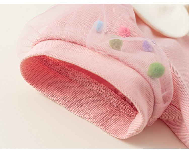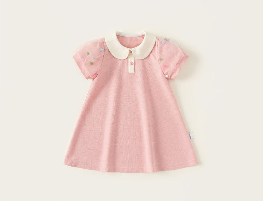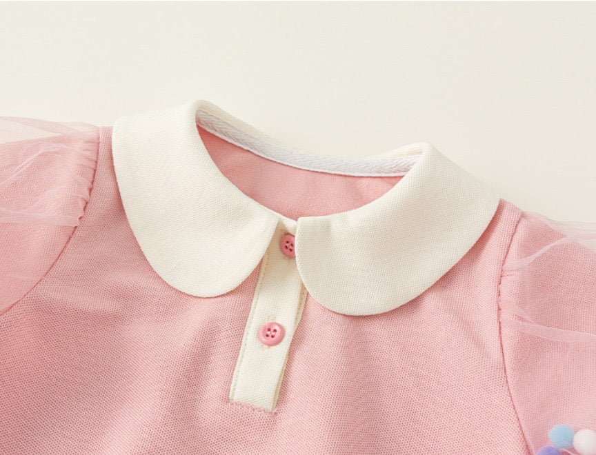 A dress which gags puff sleeve with sheer n 3D pompom details