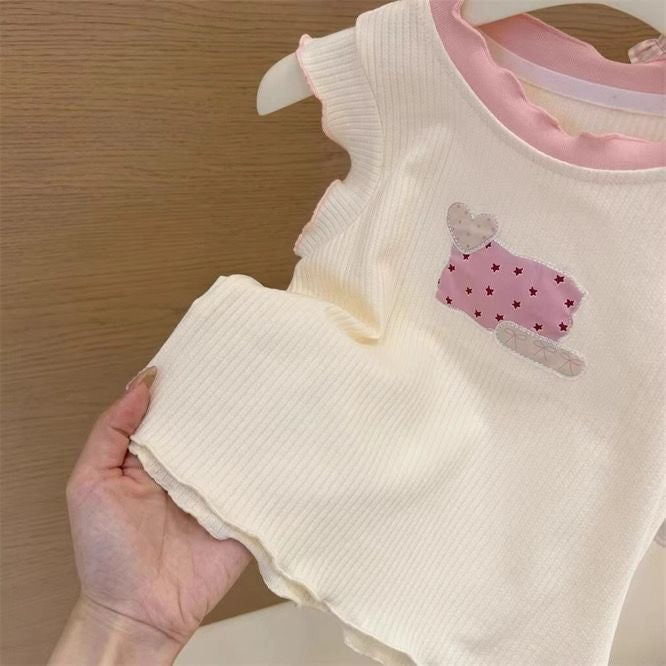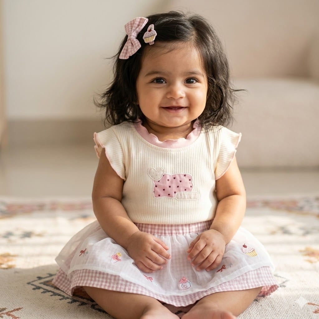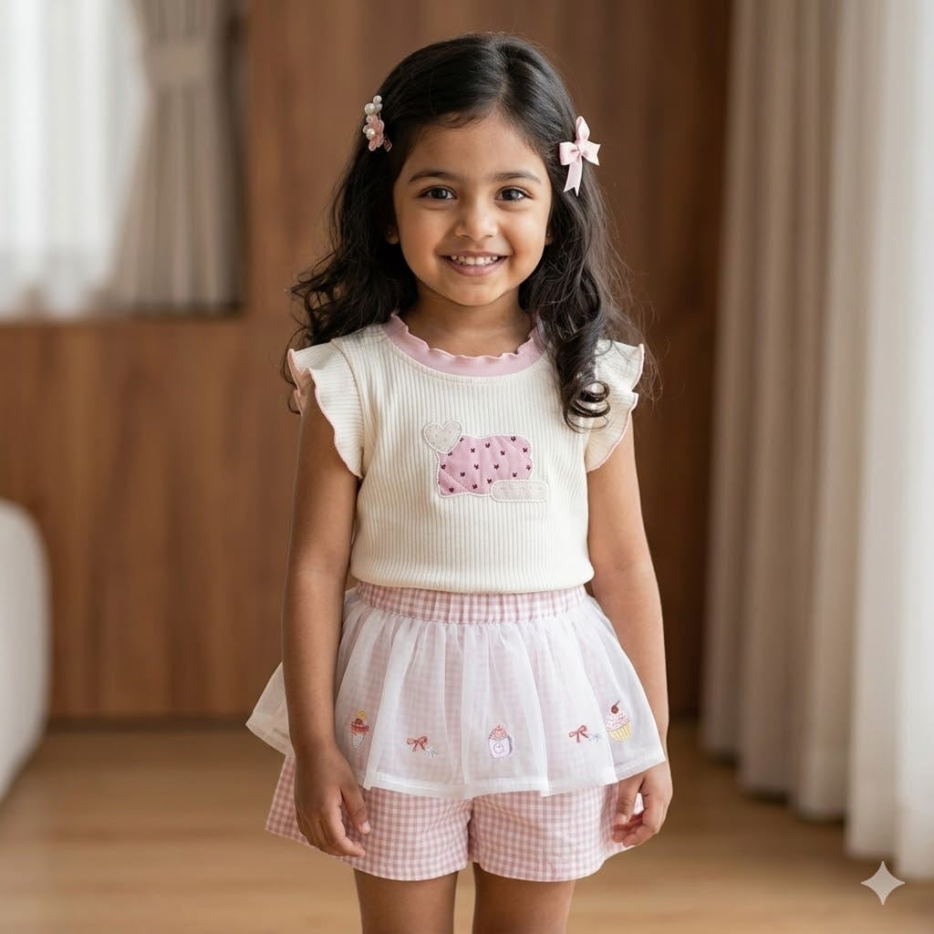 This sweet outfit is designed to make your little one shine! The top features a heart motif on the yoke, adding a touch of love and charm. Paired with a stylish skirt adorned with embroidered bows, the set is both playful and elegant — perfect for special occasions or everyday cuteness.