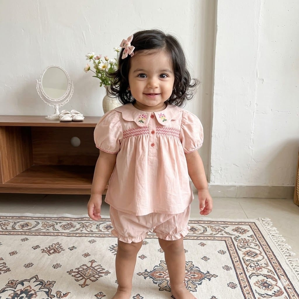 This adorable set is made to bring smiles! The top features a Peter Pan collar with delicate embroidered flower detailing around the neckline, adding a touch of sweetness and charm. Paired with soft, comfy shorts, it’s the perfect outfit for playtime, outings, or simply looking cute at home.