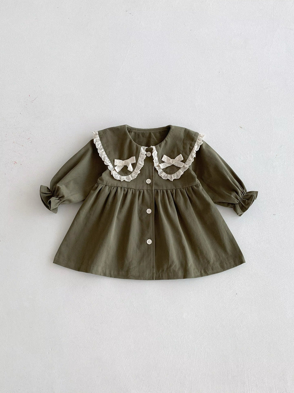A dress has Peterpan collar with bow detailing front opening which has full sleeves